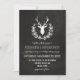 Um convite de casamento rápido e encantador em forma de etiqueta com um fundo de quadro. Neste quadro, uma cabeça de veado, com grandes chifres orgulhosos, é desenhada dentro a wreath, combinada com fontes esteticamente agradáveis em branco.