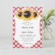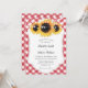 Convite de casamento de gingham vermelho ideal para uma festa de casamento rústica vermelha e amarela inspirada pelas flores de girassol. Itens correspondentes disponíveis para complementar este convite de casamento floral com girassóis em um fundo de gingham vermelho adornado com luzes de cordas.