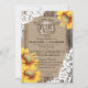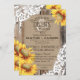 Design de convite de casamento da Rússia, a oeste, com girassóis e rendas brancas sobre fundo de linen e tábuas de madeira envelhecidas.