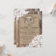 Design de convite de casamento da Rússia Ocidental com rendas brancas sobre fundo de linen e tábuas de madeira envelhecidas.