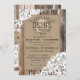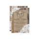 Design de convite de casamento da Rússia Ocidental com rendas brancas sobre fundo de linen e tábuas de madeira envelhecidas.