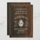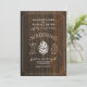 Um convite de casamento rústico com uma ilustração no centro de uma pinecona branca. O fundo é inspirado em lenha. Personalize o texto.