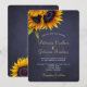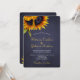 Elegante verão chic ou modelo de na moda de convite para casamento outono na noite escura do quadro azul marinho apresentando um belo buquê de girassóis e um roteiro de caligrafia em ouro branco e falso. ++++++++++++++++++++++ O convite é adequado para casamentos elegantes de Verão ou outono no país russo.