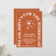 Este Convite Russo ao Casamento de Terracotta Arch Boho Minimalista contém a redação "por favor, juntem-se a nós para o casamento de" em forma de arco com estrelas teatrais e fundo de terracota. É perfeito para o casamento entre boho, rústico, boêmico, humorístico, deserto, minimalista, laranja queimado, de espírito livre.