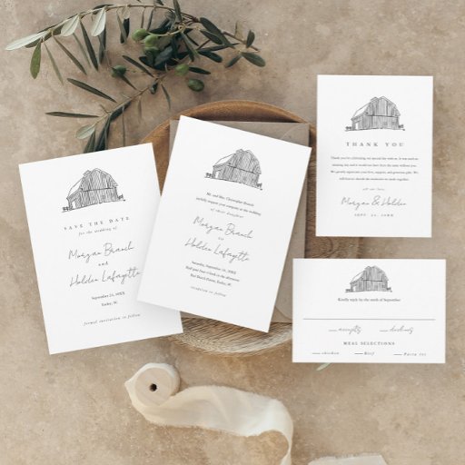 Convidações de Casamento Russo Negro e Branco do Barn Elegante. Perfeito para um casamento de chic country. Clique no botão editar para personalizar este design.