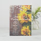 Este convite de casamento russo tem três lindos girassóis amarelos com folhas verdes e luzes de cordas. São colocados contra um fundo de madeira falsa angustiado. -