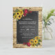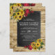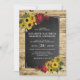Um convite de casamento rústico perfeito para o país, celeiro, fazenda ou casamentos autunares. Apresentando um fundo de madeira falsa, um quadro-negro, girassóis amarelos de Verão com rosa vermelha profunda numa cama de folhagem verde e um modelo de casamento moderno, fácil de personalizar.