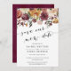 Precisa remarcar ou adiar seu casamento? Mude a data com estes bonitos cartões de "salvar nossa nova data" projetados para combinar com a nossa coleção Rustic Bloom. Os convites para casamentos florais elegantes ou quedas ou casamentos no inverno apresentam os seus detalhes representados por um spray de rosas de aquarelas, mães e verde em cores rústicas do outono, incluindo pêssego, marfim, blush, burgundy e verde.