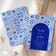 Este design rústico apresenta um padrão de fundo de azulejos portugueses, azulejos, de cor azul e branca. Personalize-o com os nomes da noiva e do noivo na escrita de caligrafia branca e o texto remanescente numa combinação de sans serif, copperplate e itálico em forma de arco azul. Um padrão de azulejo correspondente aparece no lado oposto.