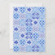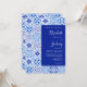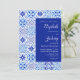 Este design rústico apresenta um padrão de fundo de azulejos portugueses, azulejos, de cor azul e branca. Personalize-o com os nomes da noiva e do noivo em script de caligrafia branca e o texto restante em uma combinação de sans serif, copperplate e itálico em um retângulo azul alinhado com a borda direita da placa. Um padrão de azulejo correspondente aparece no lado oposto.