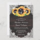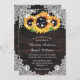 Convites personalizados para casamento de girassol rústico ideais para um país rústico, quintal ou festa de casamento de celeiro inspirados em flores de girassol. Itens correspondentes disponíveis para complementar estes convites florais rústicos de casamento com girassóis em um fundo de madeira rústica adornados com rendas florais brancas e luzes de cordas.