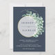 Chic e elegante convite de casamento botânico de eucalipto. Enquadre seus detalhes do dia do casamento com folhas de eucalipto em verde e folhagem azul com fundo azul da meia-noite e na moda branco. Personalize facilmente este modelo de convite com os detalhes do dia do casamento.
