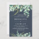 Chic e elegante convite de casamento botânico de eucalipto. Enquadre seus detalhes do dia do casamento com folhas de eucalipto em verde e folhagem azul com fundo azul da meia-noite e na moda branco. Personalize facilmente este modelo de convite com os detalhes do dia do casamento.