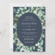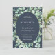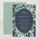 Chic e elegante convite de casamento botânico de eucalipto. Enquadre seus detalhes do dia do casamento com folhas de eucalipto em verde e folhagem azul com fundo azul da meia-noite e na moda branco. Personalize facilmente este modelo de convite com os detalhes do dia do casamento.