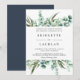 Chic e elegante convite de casamento botânico de eucalipto. Enquadre seus detalhes do dia do casamento com folhas de eucalipto em verde e folhagem de tons azuis. Personalize facilmente este modelo de convite com os detalhes do dia do casamento.
