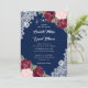 Marinho rústico personalizado azul, burgundy e blush convite de casamento com rosas e hálito de bebê contra uma burlap e fundo de renda decorado com luzes de cordas. Os detalhes de casamento são escritos em fontes modernas e na moda.