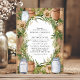 Este convite de casamento rústico apresenta uma mistura encantadora de jarras de pedreiro, burlap, e uma coroa de verde contra um fundo de madeira quente. As flores brancas e os tons suaves criam uma atmosfera acolhedora e country, fazer este design perfeito para um celeiro ou um casamento ao ar livre. A elegante serifa dentro da coroa rústica adiciona um toque de sofisticação, ideal para casais que buscam uma mistura de encanto rústico e estilo refinado.