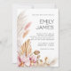 Convide seus hóspedes com este beige neutro rustico e faça um convite para o casamento do boho. Apresentando capim de pampas de aquarela macia, folhas de palma secas e sotaques florais cor-de-rosa escamosos, esta design boêmica moderna é perfeita para casamentos de celeiro, celebrações ao ar livre e temas românticos rústicos.