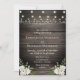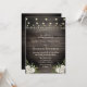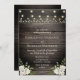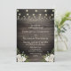 Convide seus convidados para o casamento fazenda de seus sonhos. Fundo de madeira de madeira escura e velha, com luzes de cordas penduradas contrastantes acima, e antigos cantos florais brancos de buquê na parte inferior esquerda e direita.