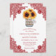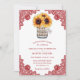 Convite de casamento russo vermelho e girassol apresentando um girassol e um dentro de buquê do hálito de bebê contra um fundo branco comum adornado com rendas florais vermelhas. Design de cartão perfeito para convidar seus convidados para a festa de casamento do país russo vermelho inspirada pelos girassóis.