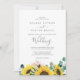 Este cartão de convite para casamento de girassol rústico é perfeito para um casamento no campo. O design floral boêmico apresenta girassóis amarelos, flores cor-de-rosa pinceladas e verde-caçador de eucalipto verde em aquarela com um elegante e moderno sentimento de bolho.