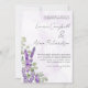 Este é um convite de casamento rústico e inspirado em boho. As flores brancas de lavanda selvagem e de folhas verdes de eucalipto sádico adornam a borda deste design, com a adição de cor d'água púrpura e salpicos. Fácil personalizar o texto para criar algo realmente exclusivo.