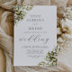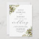 Este convite de casamento rústico tem arranjos de galho de oliveira em dois cantos. A palavra "casamento" aparece em escrita caligráfica. Personalize o texto da cinza de carvão com os nomes da noiva e do noivo e os detalhes do casamento.