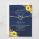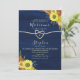 Convite de casamento de madeira rústica azul marinho elegante botânico vintage com caligrafia simples, corda de folha de ouro falsa em forma de coração e girassóis lindos. A melhor escolha para casamentos românticos de outono.