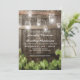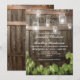 CONVITES DE CASAMENTO COM LÂMPADAS DE JARRO MASON DE BARRIL | Apresentando um fundo de barril de carvalho escuro de celeiro campestre, luzes de corda de jarro mason cintilantes, ano em que ambos se conheceram, folhas de videira com texto moderno de casamento. Encontre outros convites de casamento de madeira em http://www.zazzle.com/special_stationery*