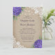 Convites de casamento de hydrangea roxa russa inspirados por flores de hydrangea roxas em uma burlap rustica e fundo de renda.