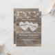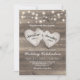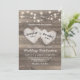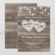 Convites de casamento rústicos campestres com fundo texturizado de celeiro de madeira, luzes de stringue e dois corações de amor esculpidos com os nomes dos noivos.