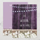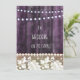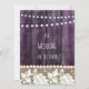 Modelo de convite de casamento rústico com rendas vintage e uma parede de madeira de uma antiga casa de fazenda em tons de roxo suave. Luzes de corda adicionam um charme aconchegante, tornando-o perfeito para casamentos, chás de noiva, noivados, save the dates e aniversários. Inclui design frente e verso por Alma Wad. Totalmente personalizável para se adequar ao seu evento.