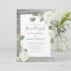 Convites de casamento florais rústicos em branco com detalhes em dourado que você pode personalizar facilmente em um belo modelo DIY fácil de usar. O design original boho em aquarela ilustrado por Raphaela Wilson retrata rosas brancas elegantes acentuadas em dourado sobre folhas de eucalipto prata-dólar em tom sage verde. Abaixo dessas flores há uma madeira de celeiro vintage em tons claros e escuros de azul-acinzentado empoeirado. Ao personalizar ainda mais o design, você pode revelar camadas ocultas que têm diferentes cores de madeira de fazenda em tons de azul-marinho, branco-marfim, burgundy-vermelho, roxo-lavanda, marrom-quente e azul-esverdeado. Nesses convites de casamento elegantes, você também tem a flexibilidade criativa de esconder a madeira completamente e escolher entre um design de lavagem em aquarela cinza ou uma cor de fundo simples e única de sua escolha. Prefere detalhes prateados em vez de dourados para sua folhagem de eucalipto? Basta ocultar as camadas douradas e revelar as folhas e galhos prateados! Esses belos convites de casamento de rosa branca complementam qualquer celebração de casamento/chá de noiva com tema de jardim ao longo do ano - seja outono, verão, primavera ou inverno. Categoria: convites