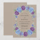 Ricas rosas e hortênsias em azul de centáurea e ameixa em aquarela formam um arranjo exuberante sobre um fundo quente de taupe. A folhagem de eucalipto prateado-verde adiciona um toque natural ao design botânico. Esta obra de arte cria uma atmosfera romântica e terrosa para um evento ao ar livre ou inspirado na natureza. A paleta de cores combina tons profundos de joia com neutros suaves.