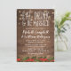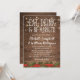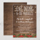 Convites de casamento temáticos de Natal rústicos com um fundo de madeira quente, luzes cintilantes, uma guarnição floral de azevinho de Natal, as palavras "COMA, BEBE E CASE-SE" e um modelo de casamento personalizado.