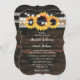 Convite de casamento russo de girassol com girassóis e lanternas contra um fundo de madeira rústica adornado com burlap e fita de rendas. Dois corações de burlap nas costas. Personalize facilmente este cartão de casamento de girassol com seus detalhes de casamento.