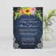 Marinho Rústico Madeira e rendas Azuis, Watercolor Floral de Girassol com Rosas, Pêonias e Convite para Casamento Verde