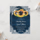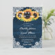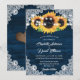 Convites para casamento de girassol azul-rústico, marinho elegante, ideais para um país rústico marinho, ou festa de casamento de celeiro inspirada pelas flores de girassol. Itens correspondentes disponíveis para complementar estes convites de casamento rústicos azuis marinhos com girassóis em um fundo de madeira rústica adornados com rendas florais brancas e luzes de cordas.