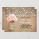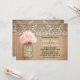 Convite de casamento rápido bonito com mason jar com hydrangea floresce rosa. Convidado perfeito para o casamento no campo com rendas vintage e sotaques de madeira em apuros.