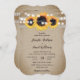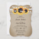 Convite de casamento russo de girassol com girassol e lanternas contra um fundo vintage de burlap adorenado com arromba e fita de rendas. Dois corações de burlap nas costas. Personalize facilmente este cartão de casamento floral do país rústico com seus detalhes de casamento.