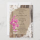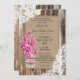 design de convite de casamento russo com orquídea magenta em um frasco de Mason envolvido com burlap, lace, e laço roxo e branco sobre fundo de linen-look e tábuas de madeira de celeiro com coração gravando com monograma no fundo.