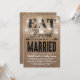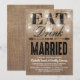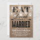 Esses convites de casamento country caprichosos vêm como um conjunto de casamento combinado com um efeito de fundo de sacaria marrom rústica, luzes cintilantes de corda de jarra de mason elegantes, as palavras "COMA, BEBE E CASE-SE" e os detalhes do seu casamento.