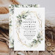 O design apresenta folhagem de greenery aérea mista aquarela e galhos em vários tons de verde com elementos de folhas de design impresso dourado sobre uma moldura geométrica dourada.