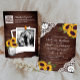 Encontrem seus hóspedes com este elegante tudo em um convite de casamento com lindos girassóis e rendas brancas em um fundo de madeira rústica com o Código QR para RSVP online. Basta adicionar os detalhes do seu evento a este modelo fácil de usar e adorar este cartão com a sua foto favorita para que ele seja um convite personalizado único.