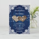 Esses convites românticos de casamento rústicos com corações de burlap contra um fundo de madeira e renda adornados com luzes de cordas são perfeitos para convidar seus convidados para sua festa de casamento de campo/celeiro azul-marinho.
