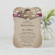 Romântica convite de casamento roxo do país rústico com dois corações de burlap e luzes de cordas em um fundo hessiano vintage enfeitado com rendas.