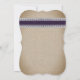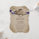 Romântica convite de casamento roxo do país rústico com dois corações de burlap e luzes de cordas em um fundo hessiano vintage enfeitado com rendas.