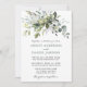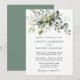 O Cartão de Convite para Casamento de Cores Biológicas Elegantes Modernos inclui folhas de eucalipto, folhagem botânica verde, folhas azuis empoeiradas e outros belos lençóis botânicos. Sage Green Back.