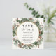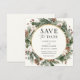 Elegante convite de Salve a Data com tema de Inverno apresenta uma moldura dourada rodeada por aquarela de sempre-verde, pinheiros e flores de inverno. Personalize com suas informações ou clique em "Clique para personalizar ainda mais" para editar estilos de fonte, tamanho e cores. Itens correspondentes disponíveis na loja Adore Paper Co Zazzle.