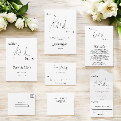 Este elegante convite de casamento preto e branco é perfeito para um casamento moderno. o simples design apresenta uma caligrafia negra elegante em um fundo branco.